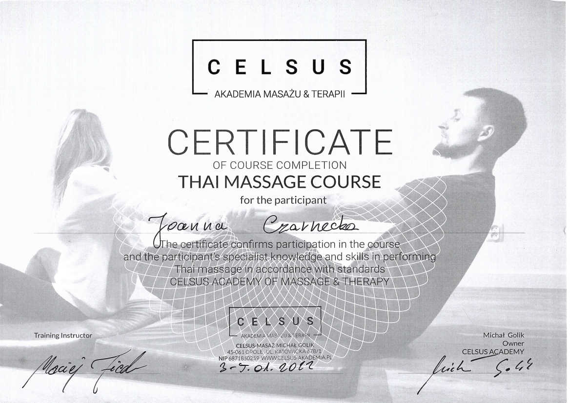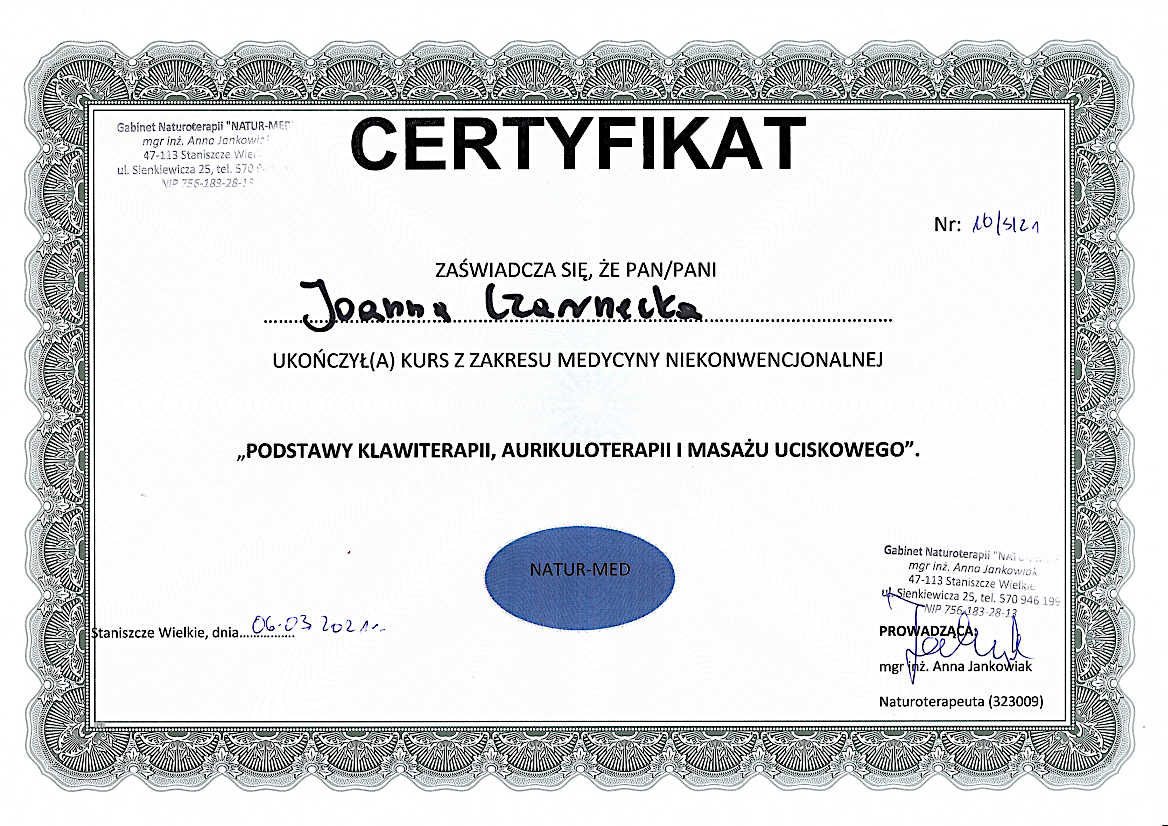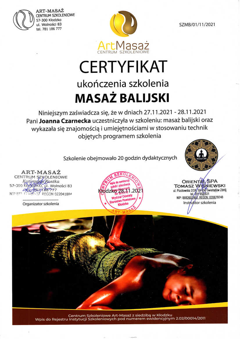 W życiu prywatnym jestem mamą i niepoprawną optymistką. I chociaż sama mam wiele pasji i ciągle jest mnie gdzieś pełno, to w gabinecie jestem po to, by pomóc odnaleźć Ci spokój, przynieść odprężenie i pobudzić procesy regeneracyjne w Twoim ciele.